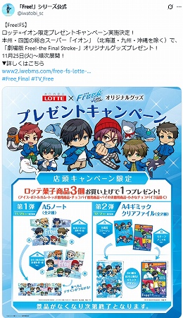 Free!公式 X(旧Twitter)のこの告知で「アイス・ボトルガム・トッポ徳用商品・チョコパイ徳用商品・パイの実徳用商品・小さなチョコパイ3品除く)ロッテ菓子3個お買い上げでいずれか1つプレゼント」