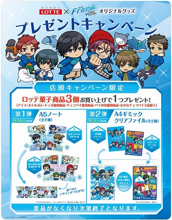 Free!公式 X(旧Twitter)のこの告知で「アイス・ボトルガム・トッポ徳用商品・チョコパイ徳用商品・パイの実徳用商品・小さなチョコパイ3品除く)ロッテ菓子3個お買い上げでいずれか1つプレゼント」