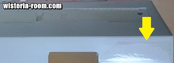 この画像はファミコンの前面の右側の端子部分(黄色の矢印)の透明シールの上に赤文字で書いてあった注意書きが、消えていました!